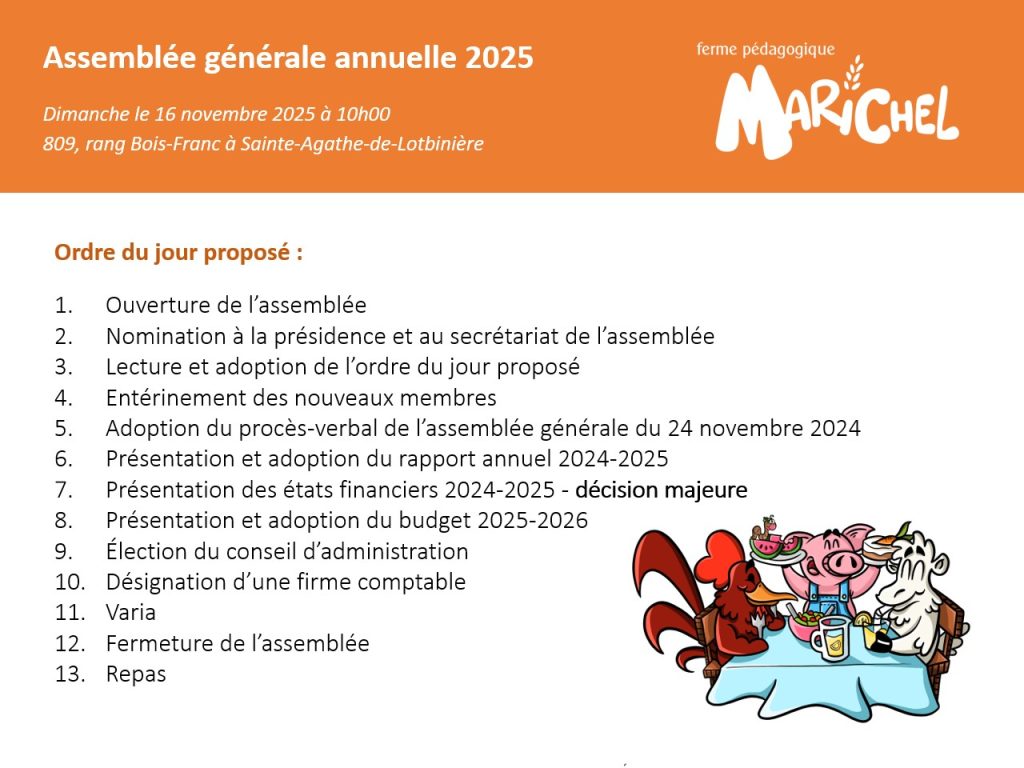 Votre présence est plus qu’importante, elle est cruciale si vous avez à cœur la mission de la Ferme. Ce sera un moment de questionnements et de nouvelles perspectives. Sachez que c’est grâce à chacun d’entre nous et à votre implication que le projet Marichel pourra continuer de vivre et de grandir. Poursuivre la mission éducative de la FPM pour les générations futures est notre priorité.
